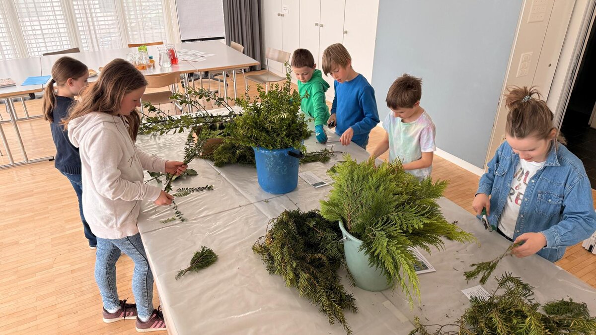 Am Freitagnachmittag, 27. März, lud die Gruppe 'Familie Chilä' zum dritten Mal zum Palmsträusschenbinden ein. Rund sieben Kinder und drei Erwachsene trafen sich um 15.15 Uhr im Pfarreizentrum, um gemeinsam ein Palmsträusschen zu gestalten.
