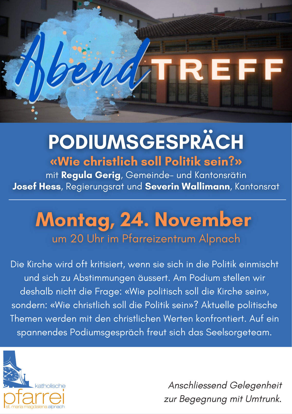 Den diesjährigen Abendtreff am Montag, 24. November um 20 Uhr im Pfarreizentrum Alpnach, gestalten wir als Podium. Alpnacher Politiker nehmen Stellung zur Frage: Wie christlich soll die Politik sein? Nach dem Podium besteht die Möglichkeit zur Begegnung bei einem Umtrunk.
