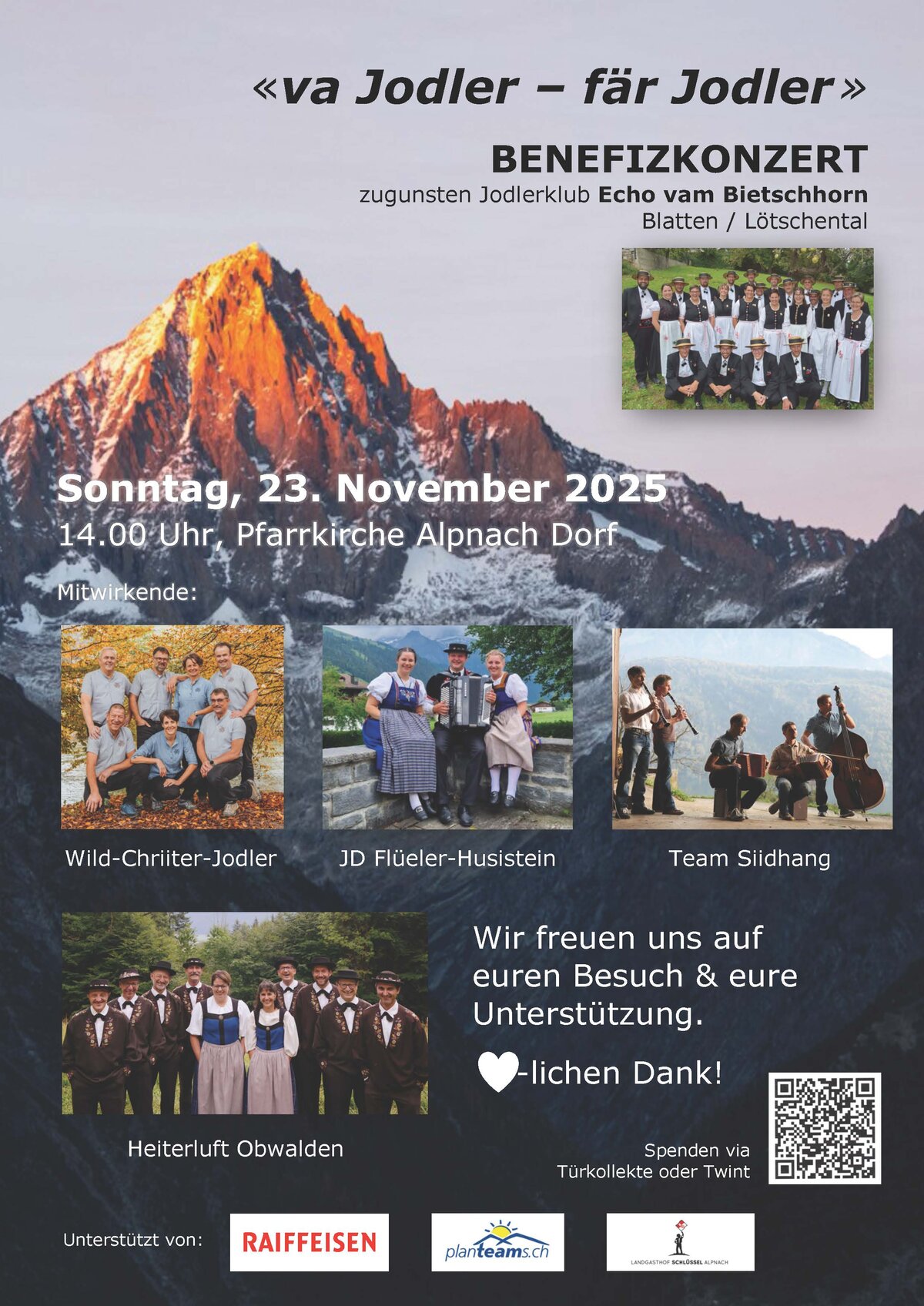 Die Jodlergruppen Heiterluft Obwalden und Wild-Chriiter-Jodler veranstalten am Sonntag, 23. November um 14:00 Uhr in der Pfarrkirche Alpnach ein Benefizkonzert zugunsten des vom Bergsturz betroffenen Jodlerklubs «Echo vam Bietschhorn» aus dem Lötschental.