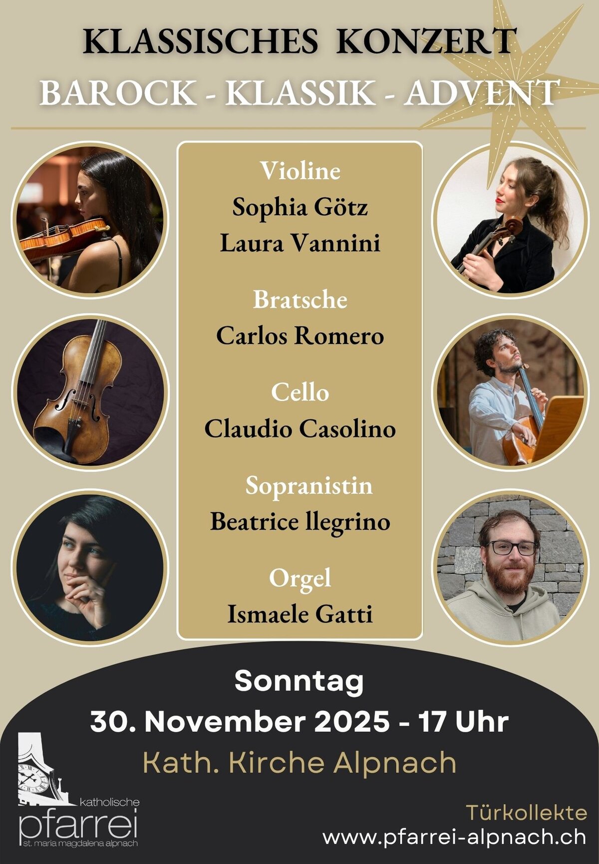 Unser Organist Ismaele Gatti spielt zusammen mit Laura Vannini und Sophia Götz an der Geige, Carlos Romero an der Bratsche und Claudio Casolino am Cello ein Konzert mit Werken aus dem Barock und der Klassik als auch bekannte Adventslieder. Begleitet werden die Instrumentalisten von der Sporanistin Beatrice Pellegrino.