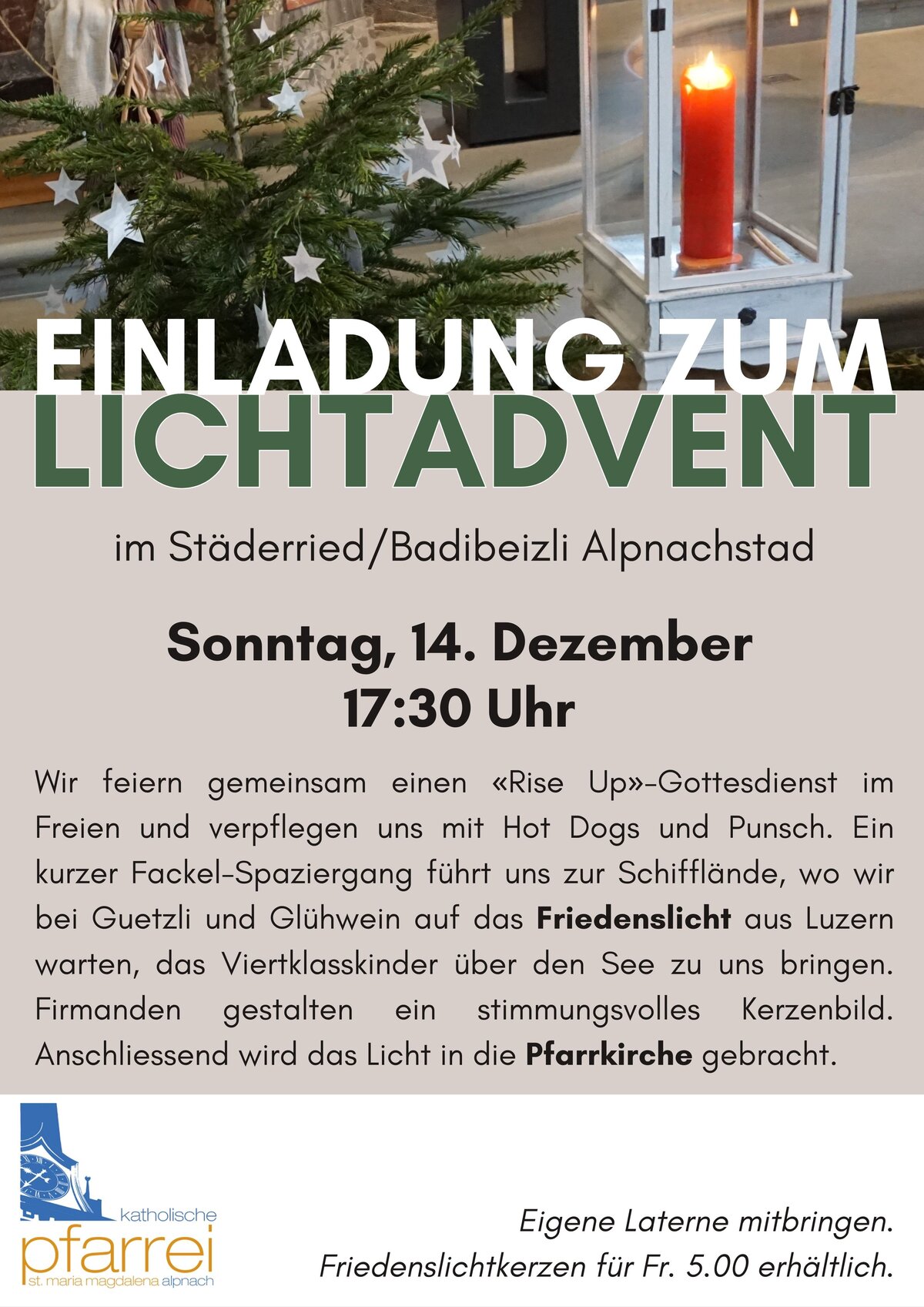 Am Sonntag, 14. Dezember 2025 laden wir herzlich zum Lichtadvent in der Freizeitanlage Städerried im Badibeizli ein. Der Abend beginnt um 17:30 Uhr mit einem Gottesdienst.