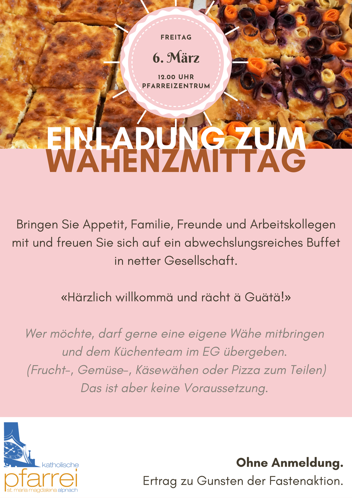 Kommen Sie ins Pfarreizentrum und geniessen Sie verschiedene, feine Wähe und eine gemütliche Mittagszeit. Eine Anmeldung ist nicht notwendig. Eine eigene Wähe mitzubringen auch nicht. :-)